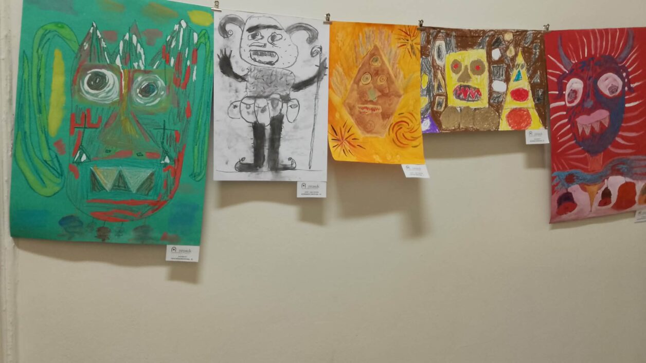 Как изглежда „Сурва“ през детските очи? Отговорът може да се види пред Детския отдел на Регионалната библиотека „Светослав Минков“, където е подредена изложба с детски рисунки и сурвакарски маски, посветени на традицията.