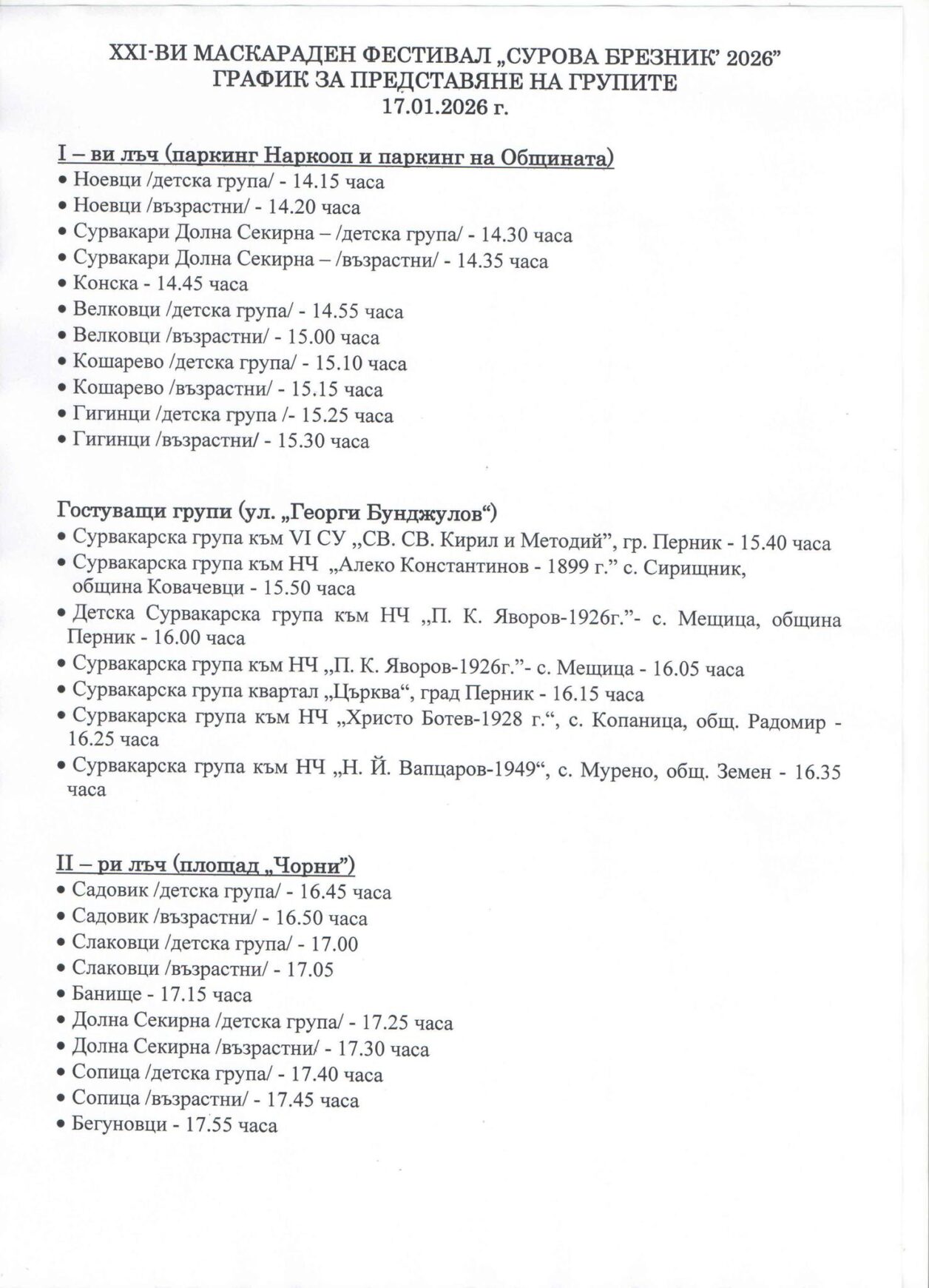 Големият финал идва в 18:00 ч. със запалването на ритуалния сурвакарски огън – символ на пречистването и победата над злото. В 18:30 ч. фестивалът „Сурова Брезник 2026“ ще бъде закрит с празнична заря, която ще освети небето над града.