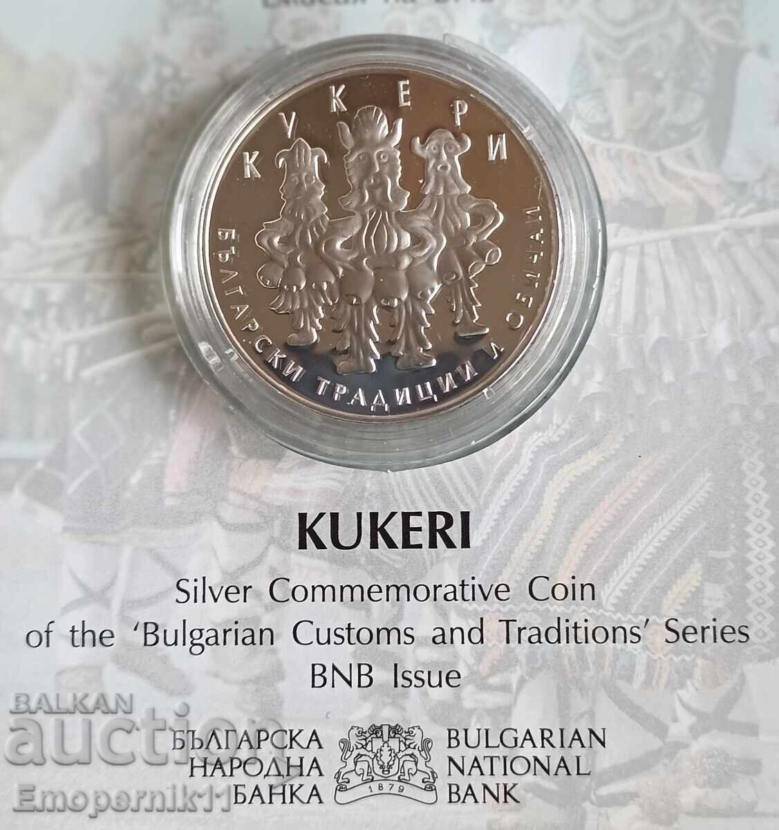 И това не е всичко. В същия аукцион има и втори тип сребърна монета с кукери – по-малка, но също висококачествена: 23.33 г тегло, диаметър 38.61 мм, гладък гурт и проба 999/1000. Тази серия е с по-голям тираж – 3000 броя, като монетата е лично закупена от БНБ.
