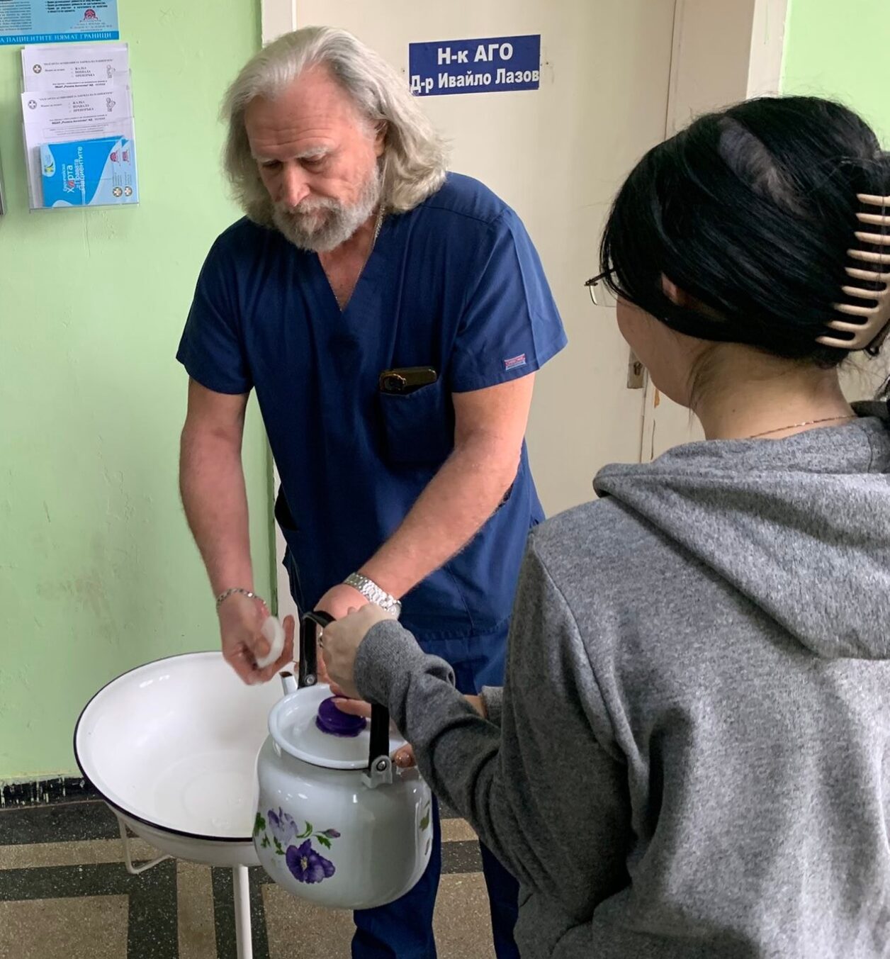 Най-младата родила в акушера-гинекологичното отделение на МБАЛ „Рахила Ангелова“ Кристина Михайлова изми ритуално ръцете на завеждащия отделението д-р Ивайло Лазов. Така беше спазен отколешният ритуал за Бабинден.