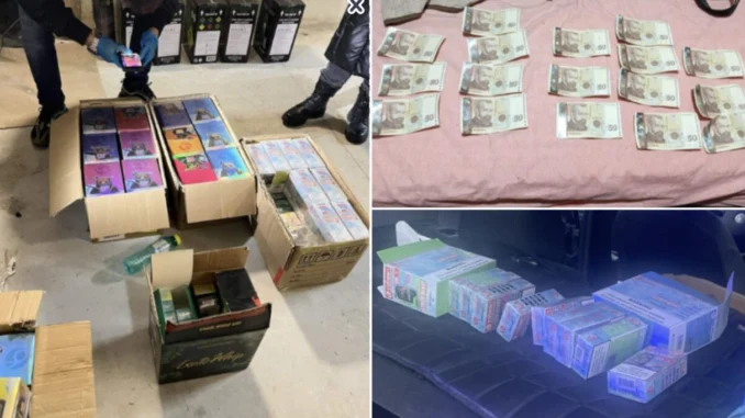 В последствие били предприети процесуално-следствени действия, при които били извършени претърсвания и изземвания в жилище в гр. Перник и гараж на територията на гр. София, ползвани от лицето. В хода на извършените действия са установени и иззети 504 броя електронни димни устройства без акцизен бандерол, 31 броя флакони с диазотен оксид (райски газ), 164 броя кутии с приспособления за употреба на диазотен оксид, 17 броя неистински банкноти с номинал 50 лева, както и около 8 килограма нарязан тютюн без акцизен бандерол.