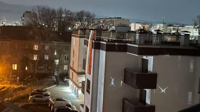 Българското знаме в огромни размери се провеси над жилищен блок в Перник в навечерието на Националния празник 3 март. Това се случва на ул. „Несебър“ 6 в града.