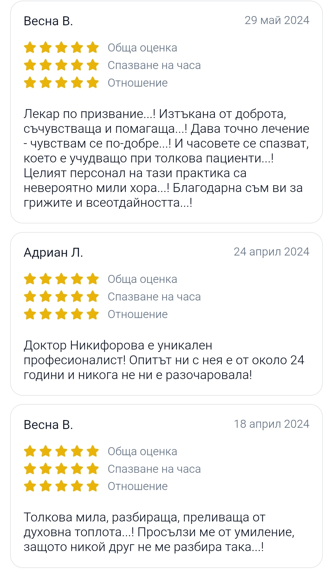 Доказателство за доверието към нея са хилядите пациенти и безапелационният ѝ рейтинг в платформата Superdoc, където тя държи почти максималната оценка от 4.9 от 5. Пациентите ѝ я описват като „лекар по призвание“ и „чудо“, което успява да внесе ред в хаоса на здравната ни система. „Колкото и да е заета, тя винаги намира време да изслуша всеки и да постави точната диагноза“, споделят благодарни перничани.