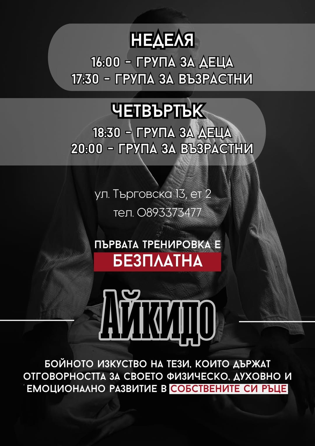 От следващата седмица центърът на улица „Търговска“ 13 се превръща в доджо (място за учение), където малки и големи ще могат да се докоснат до магията на Айкидо. Тренировките ще се провеждат всяка неделя и четвъртък, като групите са разделени за деца и възрастни. За тези, които все още се колебаят дали това е техният път, организаторите обявиха, че първата тренировка е напълно безплатна.