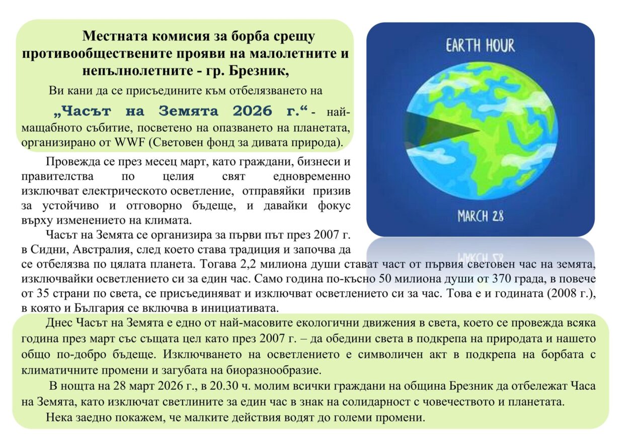 Община Брезник гази лрампите и ще се включи в глобалната инициатива „Часът на Земята“, която ще се отбележи тази събота, 28 март.