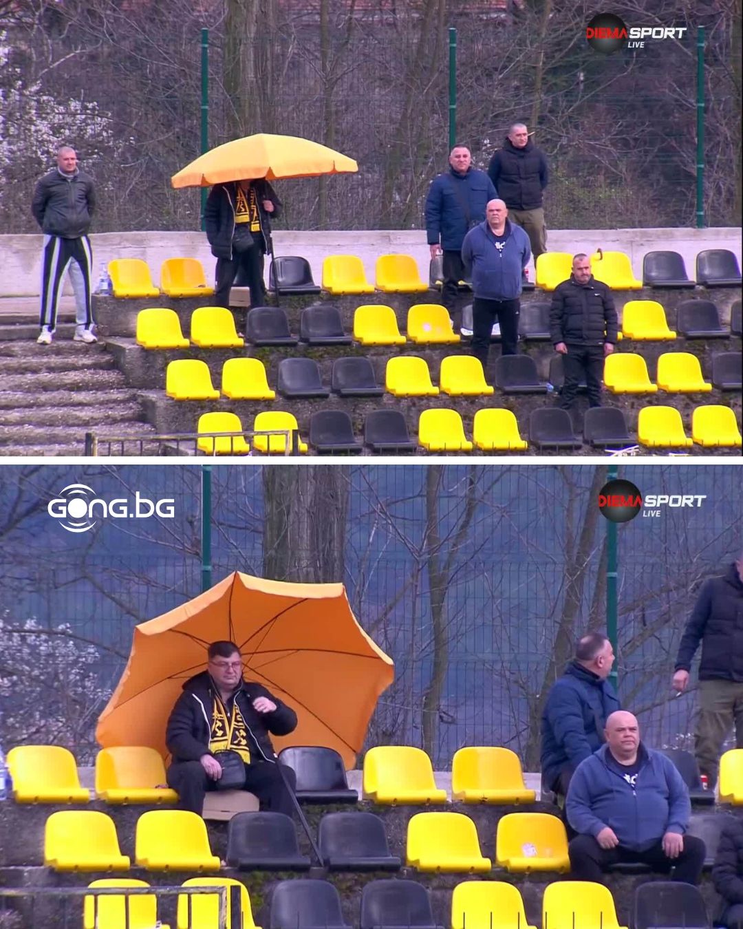 Буферо, който от години предвожда феновете, беше заловен от камерите да наблюдава срещата под огромен оранжев чадър, удобно настанен сред жълто-черните седалки. „Респект за хората, които умеят да си доставят необходимия комфорт! Това не е слабост, а стратегия“, коментират от gong.bg. За Буферо подкрепата към отбора е важна, но удоволствието от момента – задължително!