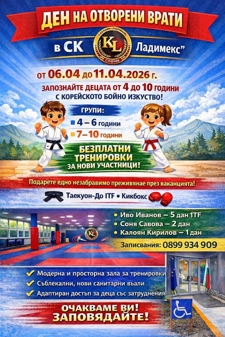 В периода от 6 до 11 април 2026 г., по време на пролетната ваканция за учениците, Спортен клуб „Калоян Ладимекс“ – Перник организира „Дни на отворени врати“, насочени към деца на възраст от 4 до 13 години, с цел популяризиране на корейското бойно изкуство Таекуон-До ITF и активния начин на живот сред подрастващите.