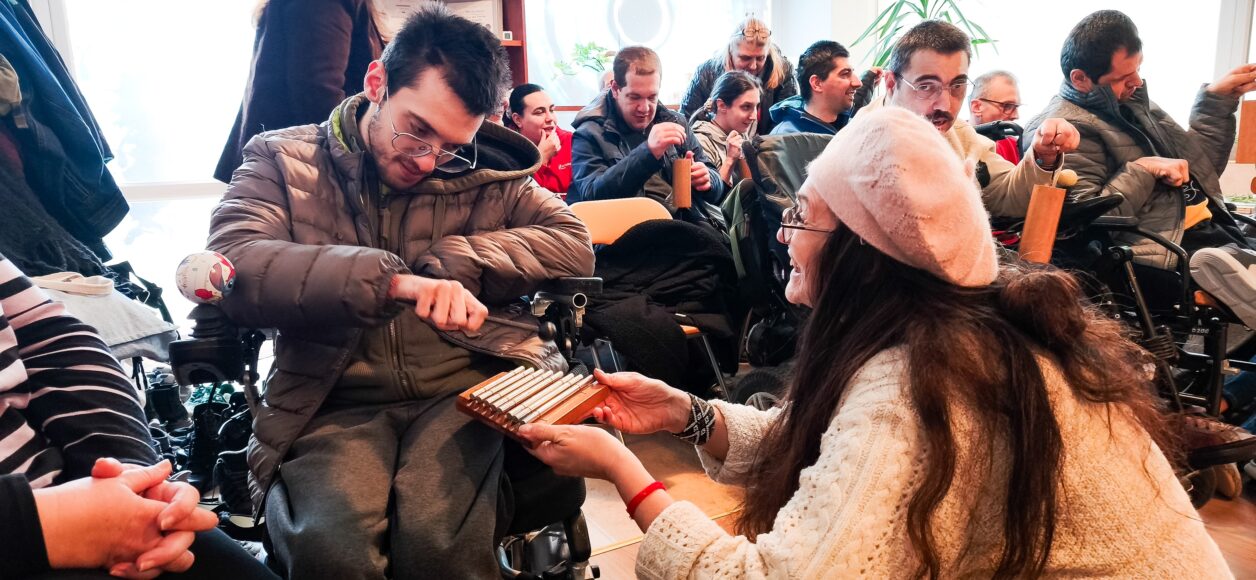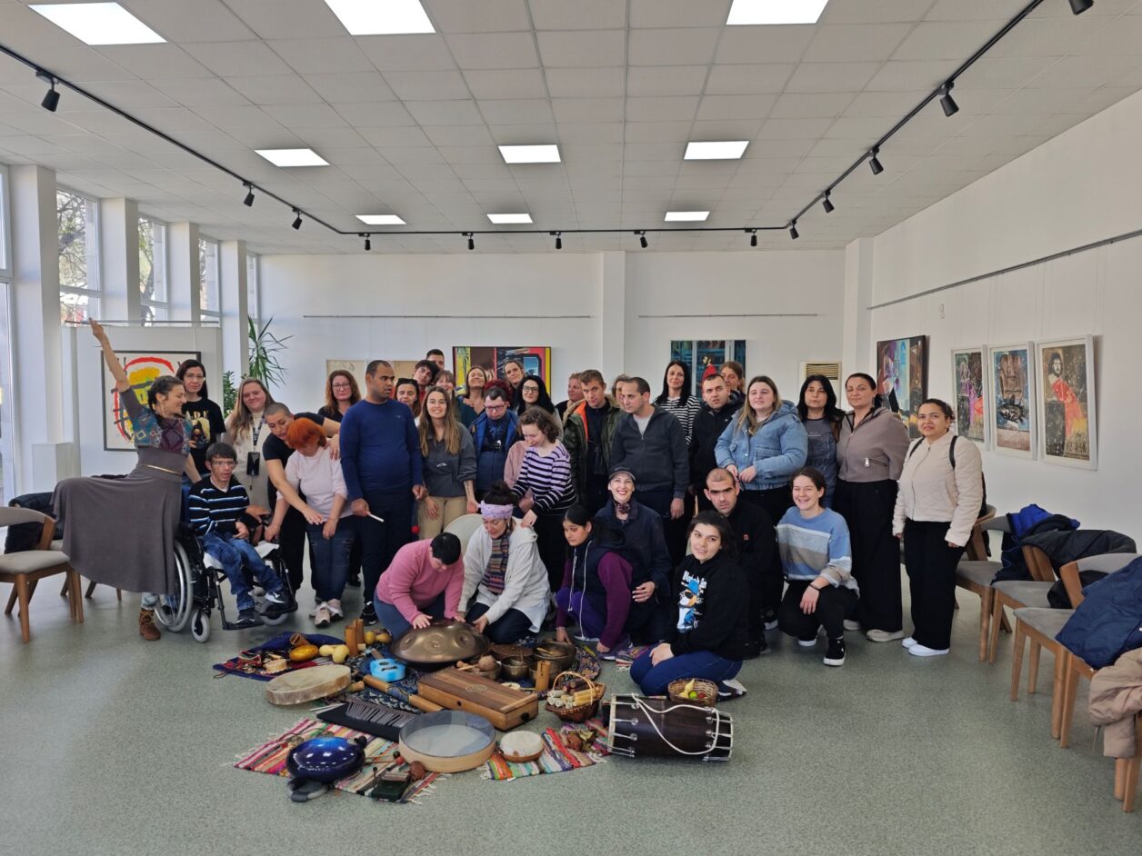 На 30 март в Градската художествена галерия в Благоевград участниците в проекта проведоха открита демонстрация на звуковата терапия. Практическият уоркшоп показа интерактивни методи и позволи на младежи с аутизъм и различни специални потребности да се докоснат до музикални инструменти и да изпитат благотворното влияние на звука, музиката и движението. Усвоените техники за работа със звука бяха приети с радост от младежите със СОП и служителите от дневни центрове, които ги съпровождаха. Те споделиха, че звукотерапията наистина осигурява емоционална и психологическа подкрепа за по-активно социално включване и себеизразяване на децата и младежите с интелектуални затруднения.