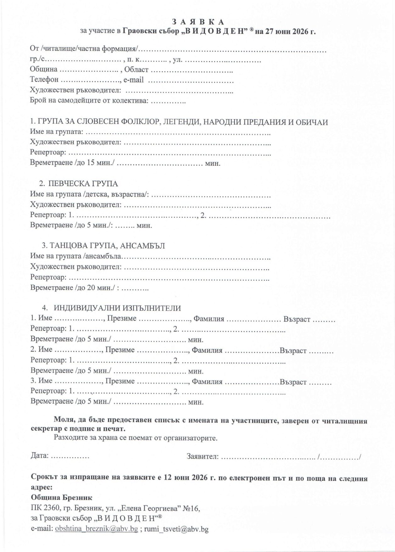 Желаещите да се качат на сцената на „ВИДОВДЕН” трябва да изпратят своите заявки най-късно до 12 юни 2026 г. Документи се приемат на адрес: гр. Брезник, п.к. 2360, ул. „Елена Георгиева” № 16, или на електронни пощи: [email protected] и [email protected].