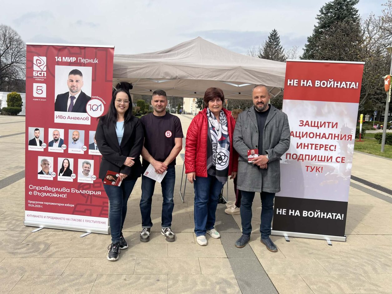 Кандидатите за народни представители от БСП-ОЛ в 14 МИР в Перник бяха на терен днес в централната част на град Перник, където разговаряха със своите съграждани, а съмишленици подкрепиха подписката. От коалицията в града съобщиха, че всеки който желае да се включи в подписката може да го направи всеки делничен ден от 9 до 17:30 ч. в офиса на БСП-Перник, който се намира на ул. „Радомир” 1.