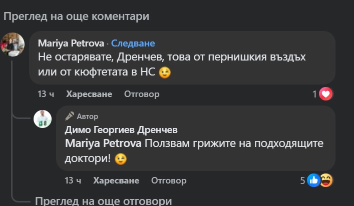 Избирателката Мария Петрова зададе странен въпрос-предположение в коментарите под снимките: „Не остарявате, Дренчев, това от пернишкия въздъх или от кюфтетата в НС.“