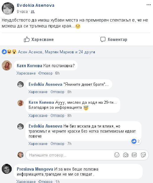 Минути по-късно бившата депутатка от гр. Радомир Евдокия Асенова призна, че едвам е успяла да изчака края на представлението и е останала до финал, само защото е имала хубави места. „Не бих искала да влиая, но трагизмът и черните краски без нотка позитивизъм идват повече“, оцени спектакъла Асенова. С мнението си отказа няколко хора да посетят спектакъла.