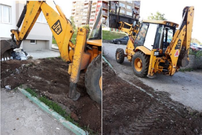 Изрязани бяха сухи клони, с помощта на багериста Коцето пространството около блока бе почистено, терена бе подравнен и насипан с фина земя.