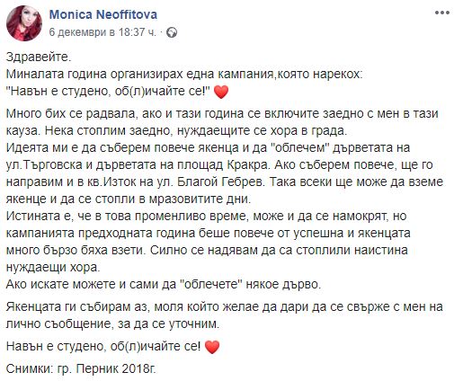 За втора поредна година красавицата Моника Неофитова от Перник, организира благотворителна акция под мотото „Навън е студено, об(л)ичайте се!“.
